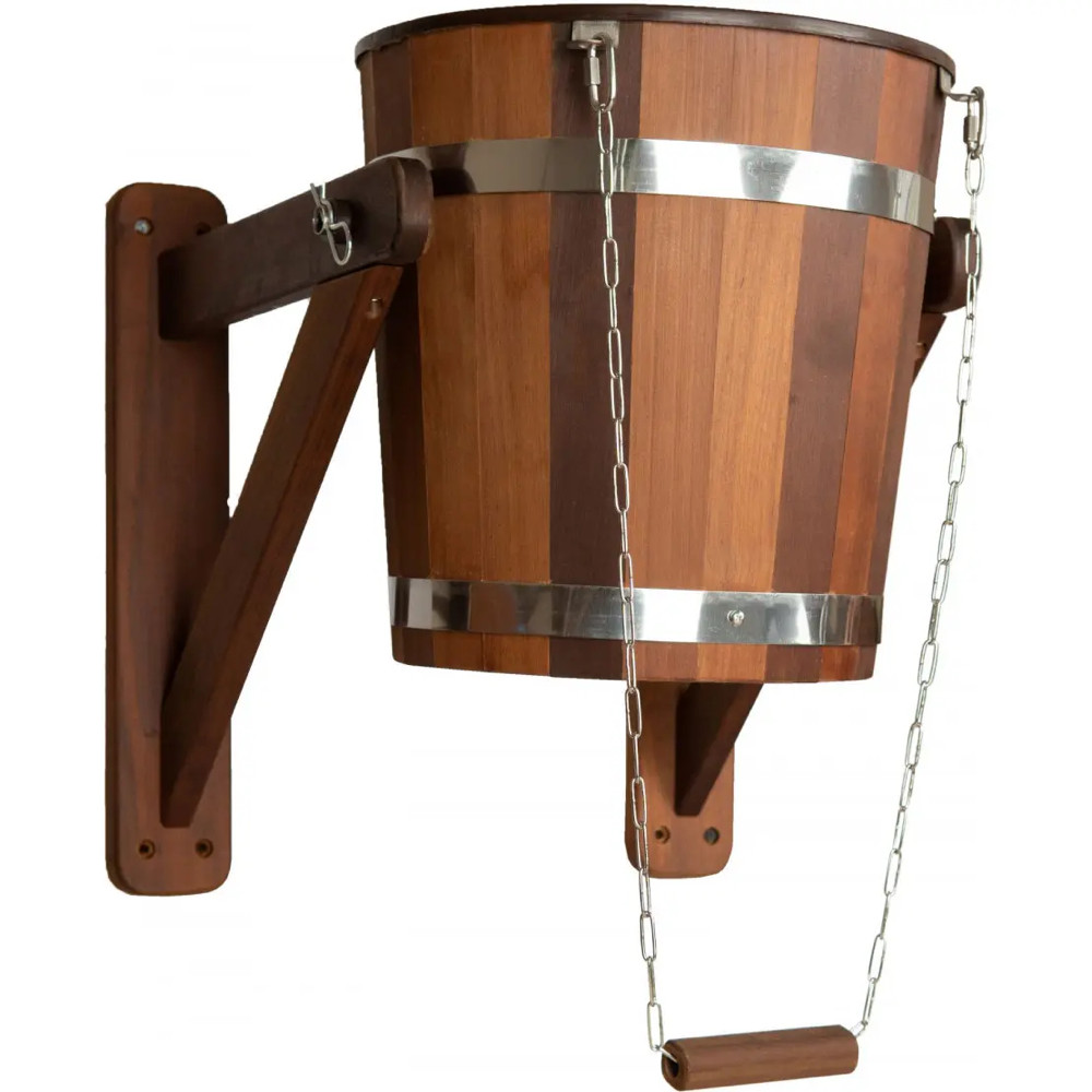 Відро-водоспад виконано з термованної липи. Всінесучі і силові елементи виготовлені з нержавіючоїсталі. Частини водоспаду, які стикаються з водоюзроблені із пластмаси. Дана конструкція є якісною ідовговічною завдяки матеріалам,використовуваним при виготовленні, і точностіобробки заготовки на верстатах з програмнимуправлінням.